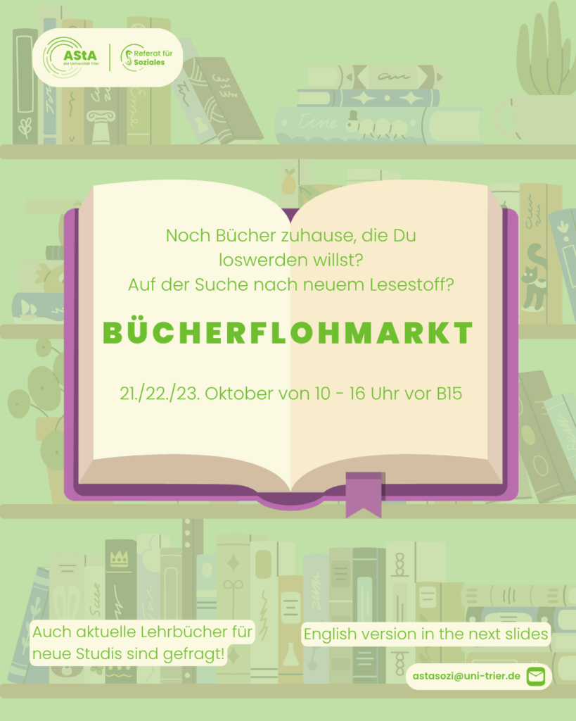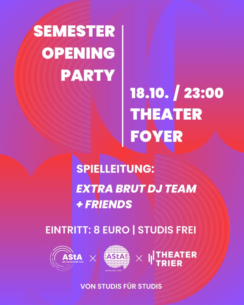 - AStA-Sitzung am 15.10.2025Liebe AStArier:innen, Fachschaften und Studierende, hiermit laden wir euch herzlich zur AStA-Sitzung ein.Sie findet unter nachfolgender vorläufiger Tagesordnung am Mittwoch, den 15.10.2025 um 16:30 Uhr imStudihaus sowie AUF ANFRAGE über untenstehenden Zoom-Link statt. Bitte meldet euch bis um 14 Uhr am Sitzungstag an, wenn ihr hybrid teilnehmen wollt. Referate & AKs:… Weiterlesen »AStA-Sitzung am 15.10.2025