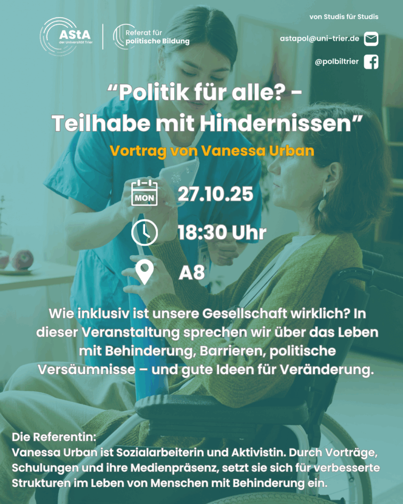 - AStA-Sitzung am 01.10.2025Liebe AStArier:innen, Fachschaften und Studierende,hiermit laden wir euch herzlich zur AStA-Sitzung ein.Sie findet unter nachfolgender vorläufiger Tagesordnung am Mittwoch, den 01.10.2025 um 16:00 Uhr imStudihaus sowie AUF ANFRAGE über untenstehenden Zoom-Link statt. Bitte meldet euch bis um 14 Uhr am Sitzungstag an, wenn ihr hybrid teilnehmen wollt.Referate & AKs: Anträge müssen… Weiterlesen »AStA-Sitzung am 01.10.2025
