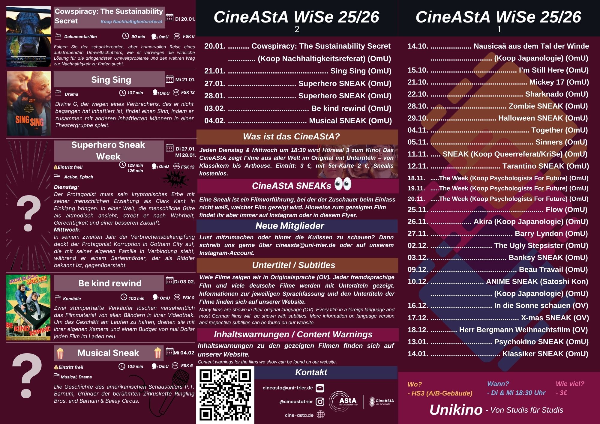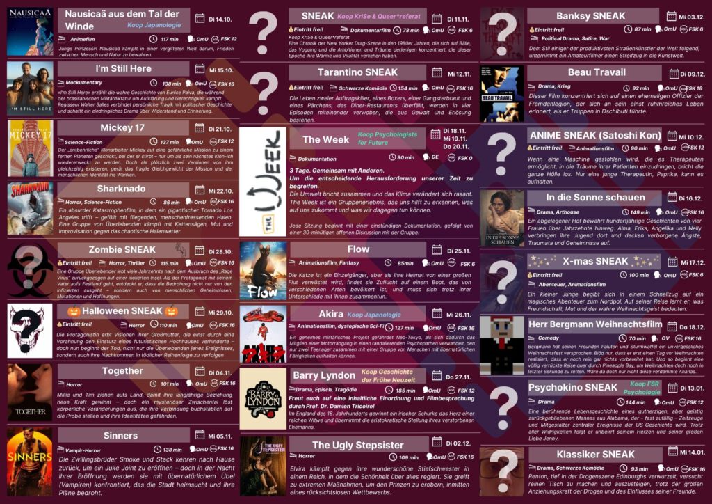 Lust auf Filme jenseits des Mainstreams? Das CineAStA bringt euch jede Woche ein abwechslungsreiches Programm: Arthouse, Klassiker, Dokus, Originalfassungen – alles, was Filmherzen höherschlagen lässt. Macht’s euch bequem, lehnt euch zurück und lasst euch überraschen.