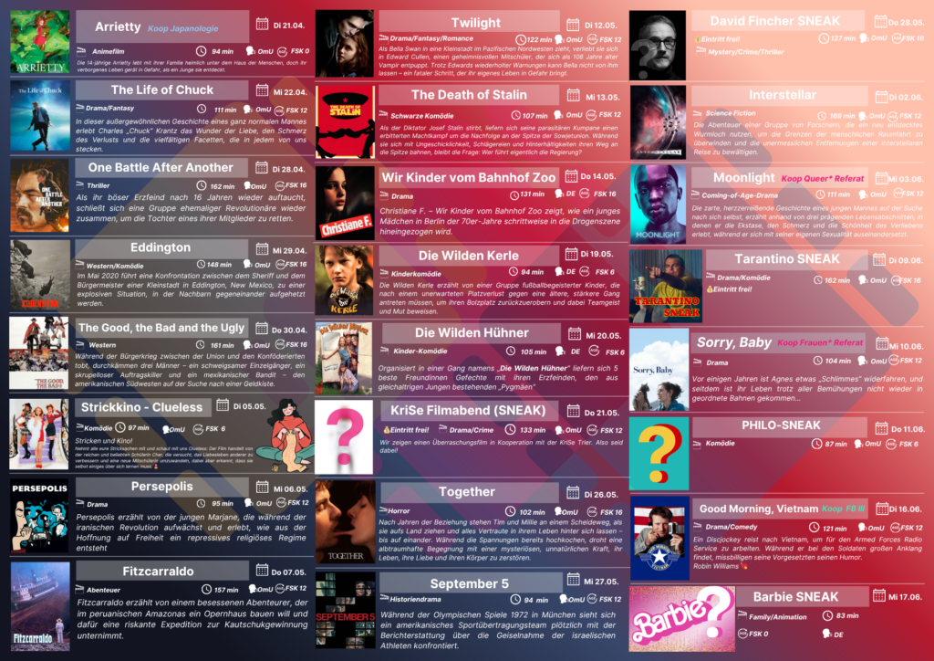 Unser aktuelles Filmprogramm findest du im Flyerständer in B 15, direkt an der Wand vor B 20 und natürlich bei jeder Vorstellung. Online bleibst du über unsere Social-Media-Kanäle immer auf dem Laufenden.