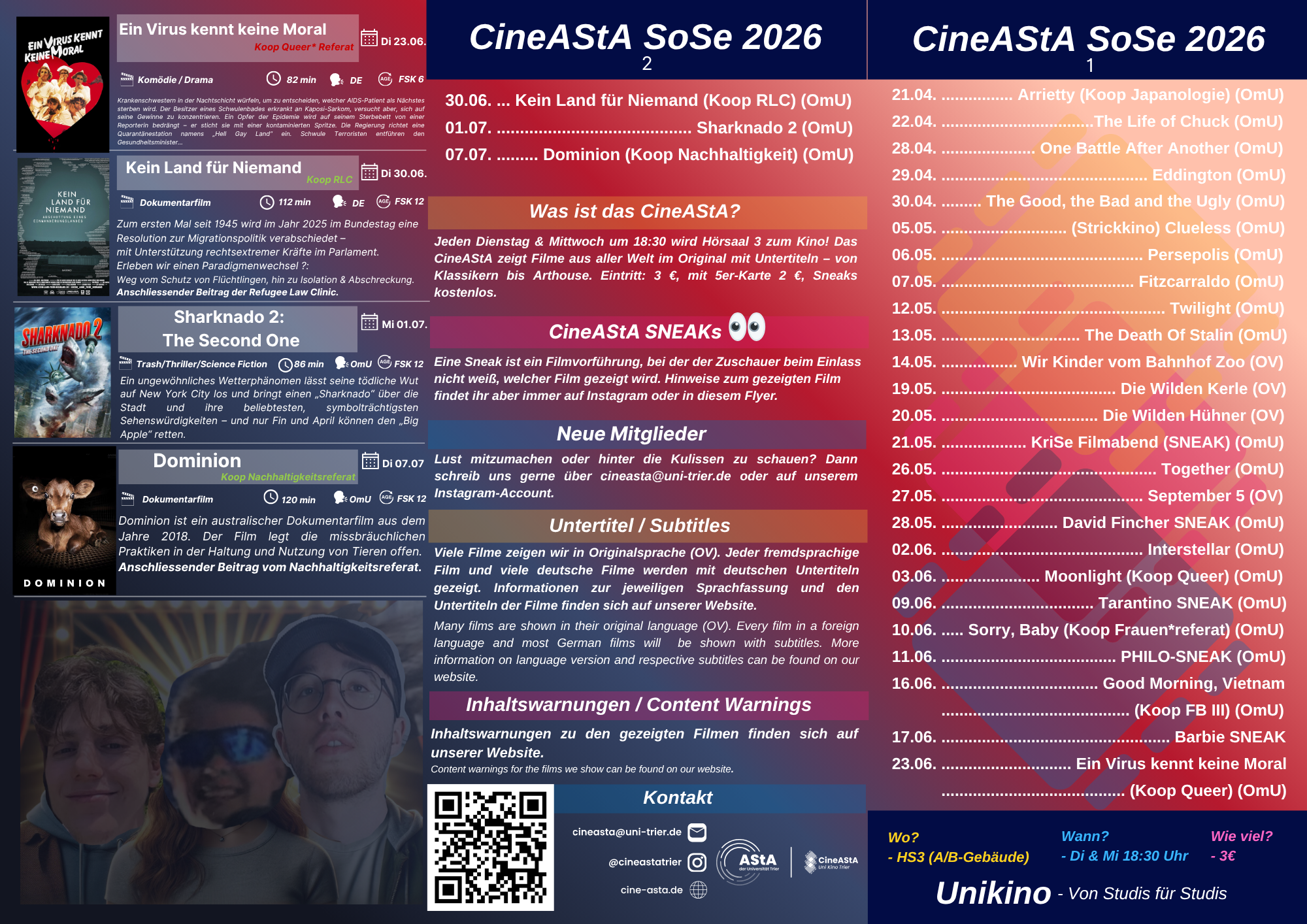 Der CineAStA ist ein ständiger Arbeitskreis des Allgemeinen Studierendenausschußes (AStA) und damit ein Organ der Studierendenschaft der Universität Trier (Körperschaft des öffentlichen Rechts). Sprecher des Kinos ist Jonas Kunz. Außerdem sind wir Mitglied im Bundesverband kommunale Filmarbeit e.V., im Kinobüro RLP und im Hauptverband deutscher Filmtheater – HDF-Kino e.V.