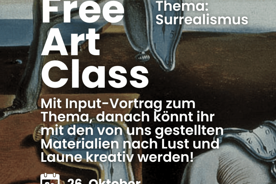 ENGLISH VERSION BELOW Das Studihaus wird wieder zum Atelier, dieses Mal zum Thema Surrealismus! Nach einem Input-Vortrag zum Thema habt ihr die freie Wahl, ob ihr das Erlernte direkt umsetzen möchtet oder aber ganz unabhängig davon kreativ werden wollt. Das… Weiterlesen »Free Art Class